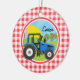 Cool, cute blue farm tractor on cute gingham; red, pink, and white chequered country pattern. Personalise this kids farmer theme product with name.