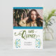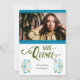 Invite your friends and family to come celebrate your big day with this photo invitation designed with traditional Mexican floral and papel picado details. Lots of pink and green with the quinceanera girl's name and photo the focus of the front. Personalise with all the details for the mass service and 15th birthday party. Available in pinks, blues, brights and warm colours. Coordinating invitation and party items available. Also appropriate for a sweet sixteen event.