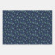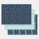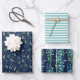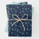 Pretty wrapping paper sheets for the holidays in a deep blue color palette featuring two patterns of blue and green twigs full of white berries, and one matching turquoise and white striped pattern.