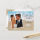 Your special engagement photo, vacation or summertime photo and the playful and fun saying, Two Less Fish in the Sea accents this wedding Save the Date Postcard on a background of aqua blue water, beach sand, seashells and starfish. The back of this Save the date Postcard is further decorated with more beach sand, seashells and starfish. If additional coordinating items are needed for your wedding just contact us at prettyfancyinvites@gmail.com with your request.