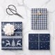 Christmas gift wrapping paper set feature ugly Christmas sweater pattern, buffalo plaid and stars pattern on colour editable navy blue background.