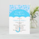 Traditional looking baby shower invitation done in white, with a large turquoise blue umbrella, covering the text area. Graphics of a blue and white raindrop pattern decorates the top of the invitation. Personalise all the text to suit your event needs.