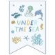 Cute and under the sea theme birthday party decor bunting flags featuring illustration of blue ocean animals. The text says "happy birthday."