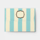 An envelope featuring a blue and white striped design covering entire outside surface. Fancy frames on front centre and back on flap.