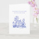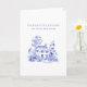 A new home greeting card with a blue line drawn illustration of a thatched roof cottage surrounded by trailing flowers.
