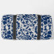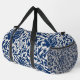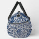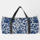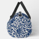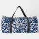 A stylish duffel bag featuring a bold floral pattern in navy blue against a light background.