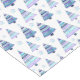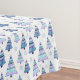 This Holiday table cloth has a pattern of modern graphic Christmas trees. All of the trees are colour coordinated in tones of blue, teal, white, and violet. Little blue stars are scattered about in the pattern, which is placed on a white background.