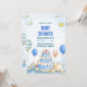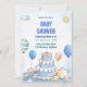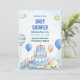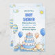 Celebrate a special baby shower with a charming watercolor invitation design. This design features soft blue tones, beautiful balloons, a delicious multi-tier cake, cupcakes, and a warm tea party atmosphere, making it perfect for a baby boy shower or a gender-neutral baby celebration.