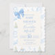 Celebrate the upcoming arrival of your little prince with this charming watercolor baby shower invitation. Featuring a delicate hand-painted blue bow and whimsical baby nursery elements like stacking rings and tiny shoes, this design exudes a soft and classic feel. Perfectly customizable for your special date, time, and location. Ideal for a sweet, boy-themed celebration.