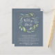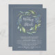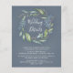 Design features a printed watercolor steel blue or deep dusty blue background with a eucalyptus wreath decorated with foliage (fern, etc.) and botanical elements in gold, shades of green and blues. The back features the same matching watercolor blue background. Elegant white typography is used within and below the wreath.