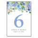 Summer Watercolor design Table Numbers featuring Pastel blue and lavender, Hydrangea, white roses, floral designs and dusty blue coloured text on an white background.