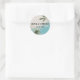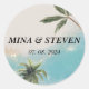 The Blue Watercolor Tropical Beach Gold Wedding Classic Round Sticker features a stunning design with blue watercolor waves, tropical accents, and elegant gold details, perfect for adding a touch of coastal sophistication to wedding invitations, favours, and decor.