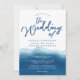 Blue watercolor wave wedding invitation with "the Wedding of" in a script font.