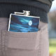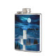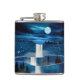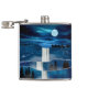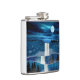 Abstract landscape scene of a a cascading waterfall with a moon, birds, and night sky and stars.
