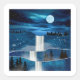 Abstract landscape scene of a a cascading waterfall with a moon, birds, and night sky and stars.