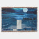 Abstract landscape scene of a a cascading waterfall with a moon, birds, and night sky and stars.