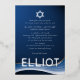 Star of David and blue wave design with bold name in silver foil. Bar or Bat Mitzvah invitation with modern, elegant text and a place for the Hebrew name also in foil.