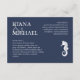 The pieces of this elegant wedding suite feature classic nautical styling with a clean, minimalist look. Stylistic waves in shades from aqua to navy blue and a seahorse illustration provide unique accents. This wedding details card shown here in white on navy blue, features plenty of room to add pertinent wedding information for your guests on both front and back. View the collection link on this page to see all of the matching items in this beautiful design or search ID836.
