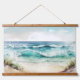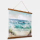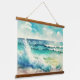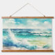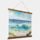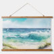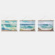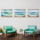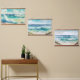 A beautiful triple set of wall hangings with wood frames with scenes at the beach in blue waves.