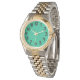 This women's watch has an art deco design of blue curved lines in a triangle shape on a field of green repeated across the design. Want a different colour? Message me.