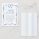 This blue wavy bow baby shower enclosure card is on trend right now. It features a hand-drawn wavy border and ribbon and bow in watercolor texture. The "books for baby" headline is in an elegant script font.