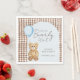 Celebrate your sweet baby boy with the We Can Bearly Wait Boy Baby Shower Napkin by Porch & Gable Design. This charming napkin features the collection’s signature watercolor teddy bear holding a blue balloon, framed by a soft baby blue arch and chocolate brown gingham plaid background. Both the name and event date are fully customisable, making these napkins a personal touch for your party décor.