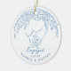 Personalized first Christmas engaged ornaments feature whimsical hand draw doodle floral, holding hands with wedding ring in blue and white, modern and elegant.
