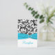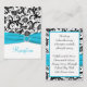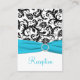 This black and white damask Reception Enclosure card has an aqua blue PRINTED ribbon and PRINTED diamond jewel brooch that would be perfect for an aqua and black themed wedding. Some of the papers will alter the colour of the design, so use caution if you choose one of the paper types besides the basic white shown here. ALSO, if you re-size the card, or if you change fonts, or the size of the font, some of the design and/or text may get cut-off. Everything will print as you see it on your monitor. I will not see your card, and Zazzle will NOT correct anything (typos, mis-alignment etc.). The text and paper is all customisable. If you need help with this card, please email me BEFORE you place your order. If you require any other matching items, please email your request to niteowlstudio@gmail.com