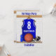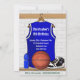 This unique birthday party invitation features a personalised blue basketball jersey hanging in a locker room with a basketball, basketball sneakers and a water bottle. The jersey is customisable with your own numbers and name, to create a truly unique birthday party invitation for the basketball player or basketball fan.