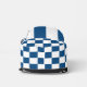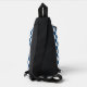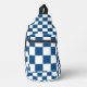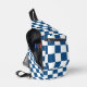 Stylish sling bag features a bold blue and white chequered pattern.