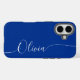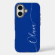Blue White Elegant Calligraphy Script Custom Personalised Name iPhone 16 Smart Phone Cases features a modern and trendy simple and stylish design with your personalised name in elegant hand written calligraphy script typography on a blue background. Designed by ©Evco Studio www.zazzle.com/store/evcostudio