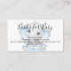 A bring a book request, ticket insert for a baby shower. A white on the front. background. Decorated with a cute blue baby elephant.