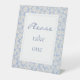'Please take one'. Chic & fresh with youthful charm. This wedding pedestal favour sign delights with a set of trendy and modern fonts set in an crisp white rectangle and framed with a blue & white floral border.