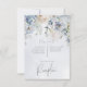 This design features a soft blue watercolor wash background with a top cascade of pale periwinkle blue and white flowers. This design is part of the Blue & White Floral Modern Wedding Suite Collection created by Simply Farmhouse Press.