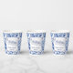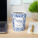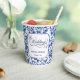 A wedding paper cup with a blue and white floral toile design and calligraphy elements.