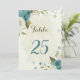 Beautiful romantic table number card featuring blue and white flowers and some pretty green leaves .