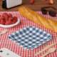 Blue and white gingham pattern is made of blue, white, and light blue squares in a bold buffalo plaid.