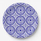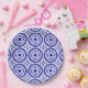 An original delft-inspired faux tile pattern in blue and white with ornate scrolls.on the edges and a centre with a gothic pattern of crosses and leaves.