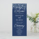The front of the program features a captivating display of hanging lights gracefully adorning the navy blue background, creating an atmosphere of romance and magic. The carefully selected mix of a simple block font and a beautiful script font for the text adds a touch of sophistication, perfectly complementing the beauty of your wedding.