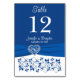 This romantic double-sided royal blue and white floral wedding table number card has an image of a royal blue and silver filigree heart over top of a royal blue ribbon image running across the bottom of the card with blue flowers on a white background along the bottom. There is a royal blue text area above the ribbon and it has the table number, the names of the bride and groom, and the wedding date in white. **YOU MUST CHANGE THE NUMBER ON THE CARD FOR EACH NUMBER YOU NEED, ADD IT TO YOUR CART, THEN RETURN AND REPEAT THE PROCESS FOR EACH NUMBER YOU NEED. If you need any additional matching items, please email your request to niteowlstudio@gmail.com or use the Zazzle chat feature to get in touch.
