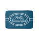 Bath mat with a blue background and white design with the words Hello Beautiful
