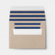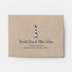 Envelope featuring a one of a kind hand drawn lighthouse in a blue and white colour theme on the front with customised address. The kraft background texture is an image and is optional. There are blue stripes in the inner lining. Text is blue in a modern and brush script font. Colours and fonts and are customisable.