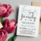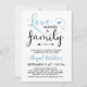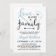 Blue and white adoption baby shower invitation with cute hearts. Blue adoption shower invitation with Love makes a family in a charming typography design.