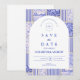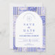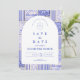 A timeless blue and white design inspired by classic Delft porcelain and French toile patterns. The patchwork tile border combines delicate florals, stripes, and ornamental motifs that evoke vintage European ceramics. A soft arched panel in the center keeps the layout refined and elegant while allowing the details of the porcelain-inspired pattern to frame the celebration beautifully. Perfect for couples planning a sophisticated blue and white wedding with traditional European charm.