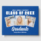 This trendy blue custom senior senior portrait photo collage graduation guest book features white varsity letters for the Class of 2025 under your college or high school name. Customise with your favourite 3 graduate photographs for your party.