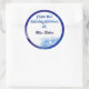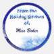 A custom baking or canning gift tag with letters decorated with snowflakes in blues on a white medallion against winter holiday art with an elegant pattern of pine boughs and pinecones in blue and white on an icy background of blues and violet.