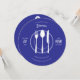 Elegant custom round dinner invitation featuring a clean blue background with stylish white text. Adorned with charming illustrations of a spoon, fork, knife, plate, and covered food in the background, perfect for sophisticated events and special gatherings. Make your invitation stand out with this refined design.