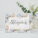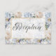 This wedding reception card design features a beautiful soft periwinkle blue and white rustic floral pattern on a dusty periwinkle blue aged background. The text is displayed on a soft white transparent text area with a faux gold glitter frame. the back continues the floral pattern. This card is part of the Blue & White Rustic Floral Gold Frame wedding suite created by Simply Farmhouse Press.