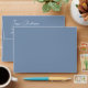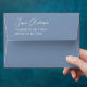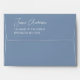 A blue and white envelope. The outside is blue, with the return address printed in white on the flap, with the name in script.