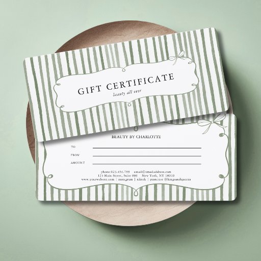 Add a feminine, on-trend touch to your branding with this elegant blue and white striped gift certificate featuring a delicate coquette bow and ornamental frame design. The soft stripe pattern combined with the vintage-inspired ribbon bow detail creates a refined boutique aesthetic that feels romantic, stylish, and timeless.